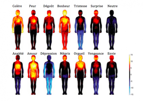 Les couleurs chaudes (rouge et jaune) représentent les zones activées par les émotions alors que les couleurs froides (bleu) montrent celles qui sont désactivées par nos sensations.